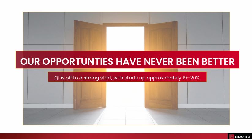 student start growth to increase 19% compared to the year-ago first quarter,” commented Mr. Shaw. “America’s continuing skills gap and the growing interest in learning skilled trades along with our strategic initiatives have positioned Lincoln for